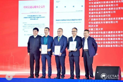 中國交通運輸協會副會長褚飛躍、新技術促進分會副會長兼秘書長于丁為起草單位代表頒發標準公告函
