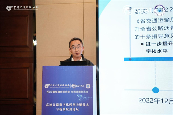 浙江數(shù)智交院科技股份有限公司副總工程師、智能交通研究院院長崔優(yōu)凱報告題目為《浙江省公路基礎(chǔ)設(shè)施數(shù)字化轉(zhuǎn)型升級關(guān)鍵技術(shù)與應(yīng)用》。報告圍繞浙江省公路基礎(chǔ)設(shè)施數(shù)字化轉(zhuǎn)型升級工作,重點介紹在高速公路智能收費、智慧服務(wù)區(qū)等典型場景下關(guān)鍵技術(shù)的探索,以及在相關(guān)工程中的應(yīng)用情況,為推動交通基礎(chǔ)設(shè)施數(shù)字化轉(zhuǎn)型升級提供參考。