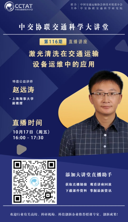 直播預告 | 中交協聯交通科學大講堂第117期:趙遠濤《激光清洗在交通運輸設備運維中的應用》
